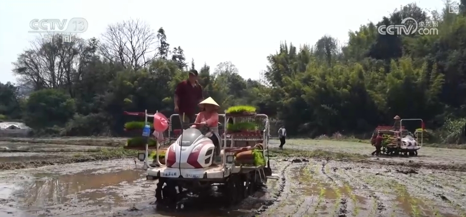 正在赣州定南县岿美山镇的农田里,旋耕机和插秧机交替功课。旋耕机翻耕平整过的地盘,插秧机再颠末之后,秧苗就划一地栽插到田里。农户们正正在手工插秧。