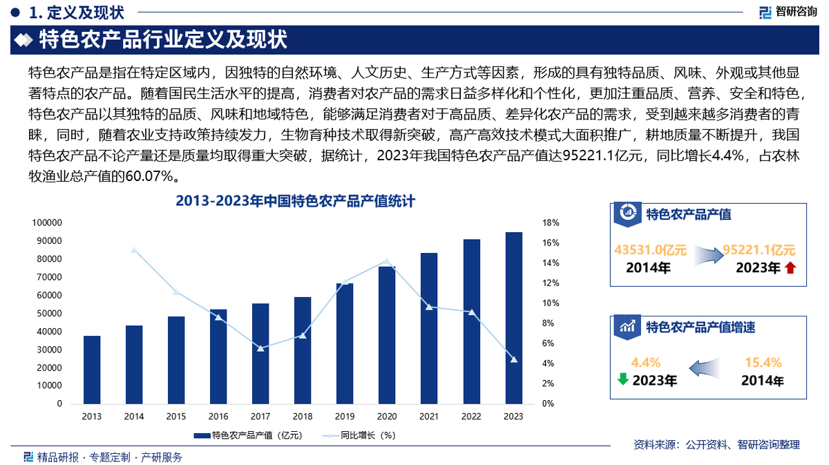 特色农产物是指正在特定区域内,因奇特的天然、人文汗青、出产体例等要素,构成的具有奇特质量、风味、外不雅或其他显著特点的农产物,这些农产物往往具有较高的出名度、佳誉度和市场所作力,能表现出本地的特色和劣势。按产物来历分歧,特色农产物能够分为特色动物类农产物、特色动物类农产物和特色微生物类农产物;按加工体例分歧,特色农产物能够分为初加工特色农产物和深加工特色农产物。跟着国平易近糊口程度的提高,消费者对农产物的需求日益多样化和个性化,愈加沉视质量、养分、平安和特色,特色农产物以其奇特的质量、风味和地区特色,可以或许满脚消费者对于高质量、差同化农产物的需求,遭到越来越多消费者的青睐,同时,跟着农业支撑政策持续发力,生物育种手艺取得新冲破,高产高效手艺模式大面积推广,耕地质量不竭提拔,我国特色农产物非论产量仍是质量均取得严沉冲破,据统计,2023年我国特色农产物产值达95221。1亿元,同比增加4。4%,占农林牧渔业总产值的60。07%。