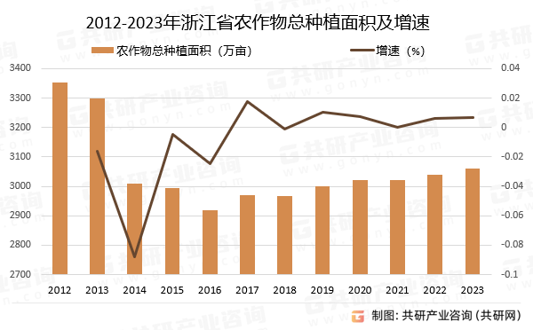 2012-2016年,浙江农做物总种植面积呈逐年下降态势,谷值为2016年的2919。68万亩;受省及相关部分持续出台的农业财产相关政策的激励,2017-2023年,浙江农做物总种植面积波动回升,2023年已达3062。08万亩,因种植业高度依赖地盘资本,估计后期农做物总种植面积仍将不变正在3000万亩以上。