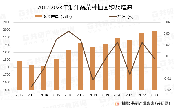 近年来,浙江积极成长蔬菜、生果、食用菌等农业从导财产,不竭优化农业出产布局,积极鞭策特色农业成长,添加绿色优良农产物供应,蔬菜产量跃居农产物产量首位。2012-2023年,浙江蔬菜产量从1794。38万吨波动增加至1992。51万吨,增加了198。13万吨,增幅为11。04%。