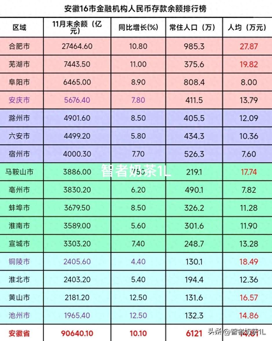 存款余额是反映一个城市金融实力的主要目标,区域核心及经济发财市占优,省汇合肥各项存款2。74万亿元,皖西北核心阜阳存款余额6465亿元,皖西南核心安庆5676亿元,辐射生齿都跨越万万。最初看下人均环境,经济规模大,汇集资金能力强,遥遥领先。芜湖人均19。82万元,铜陵人均18。49万元,黄山人均16。57万元,池州人均14。86万元。